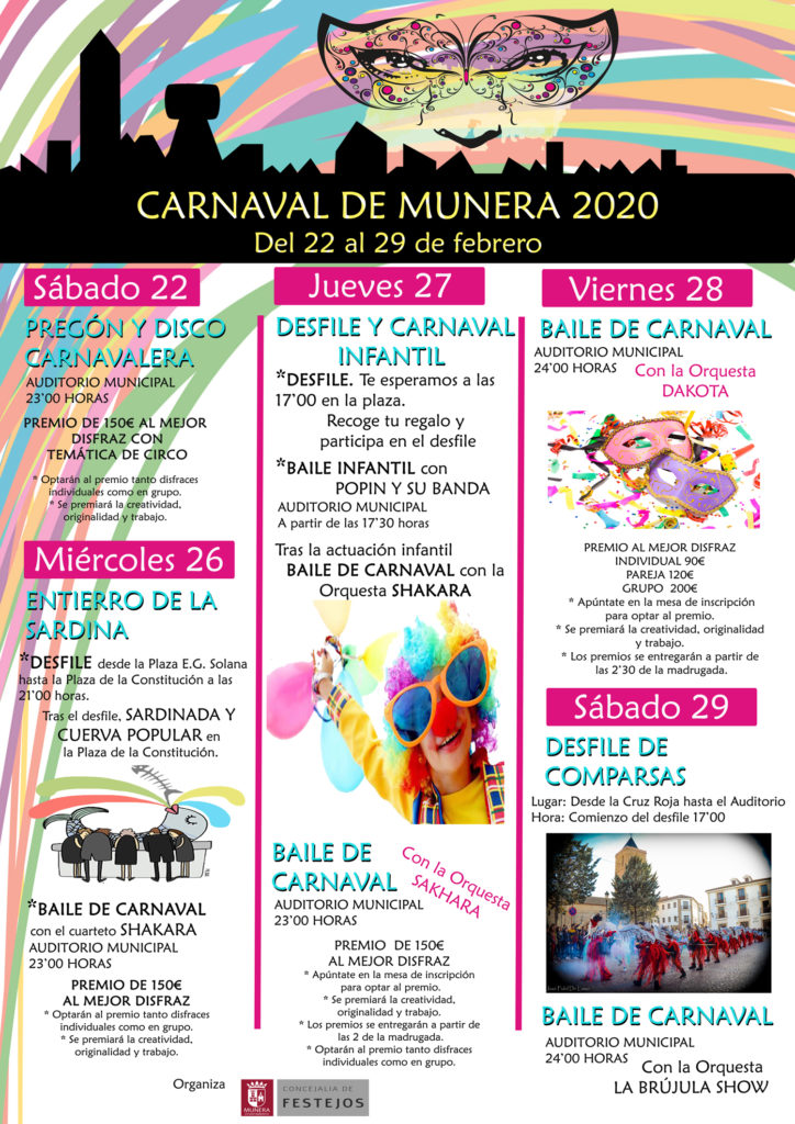 La fiesta más alocada de Munera, el Carnaval que en este año 2020 se celebrará del 22 al 29 de febrero. Un período de permisividad y cierto descontrol oculto tras la desvergüenza de Don Carnal, con algunas novedades, ya que en esta edición todos los Bailes de Carnaval se celebrarán en el Auditorio Municipal y el desfile del Entierro de la Sardina y el de comparsas cambian su itinerario.